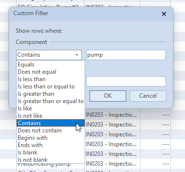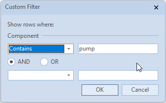 If you would like to display for example all components that contain "pump" you could either use filtering by selection as described above or you can use custom filtering.