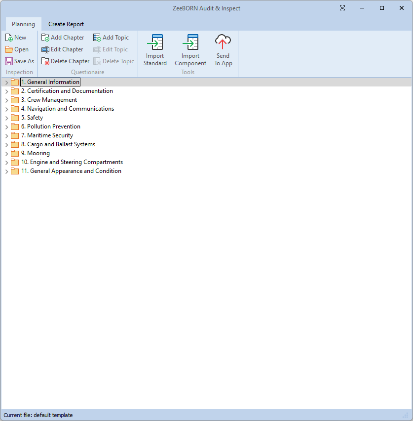 The desktop client is used for preparing inspection tasks by manually adding chapters and topics, copying audit standards from the ZeeBORN systems library and copying component data from selected vessels.