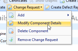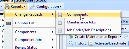 Where enabled, you'll find a menu Change Request that gives you access to the different change request creation options. For components, maintenance jobs and job codes, this feature can be found in the Components section of the Planned Maintenance module - the change request feature for spare parts can be found in the Stock section of the Planned Maintenance module.