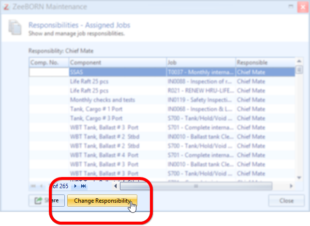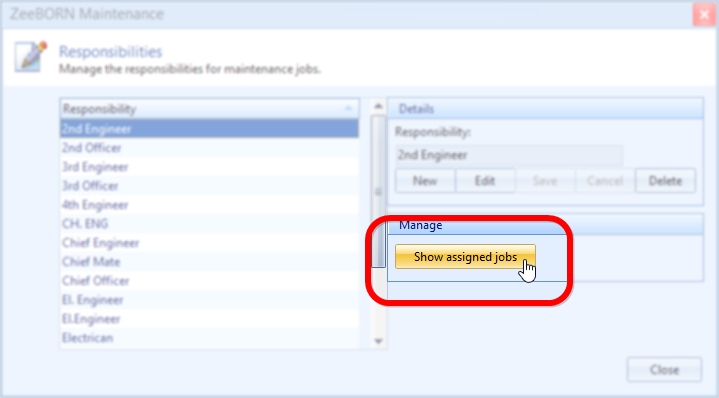 Choose one of the responsibilities shown in the list and click the button "Show assigned jobs" to see a list of all maintenance jobs currently assigned to this responsibility.
